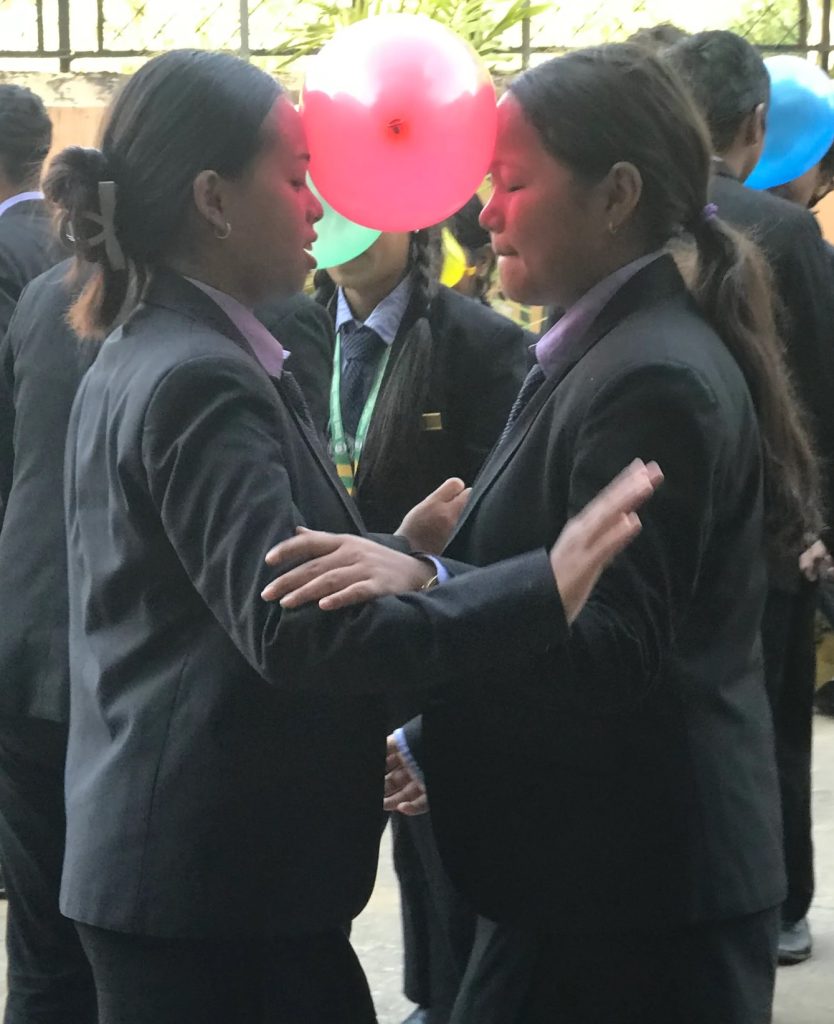His point is proven when everyone returns to the courtyard to socialise and play an intricate, hilarious game in which two pupils must balance a balloon on their foreheads while dancing to music. The laughter and banter are familiar; this looks like any other schoolyard, and that is exactly the point.